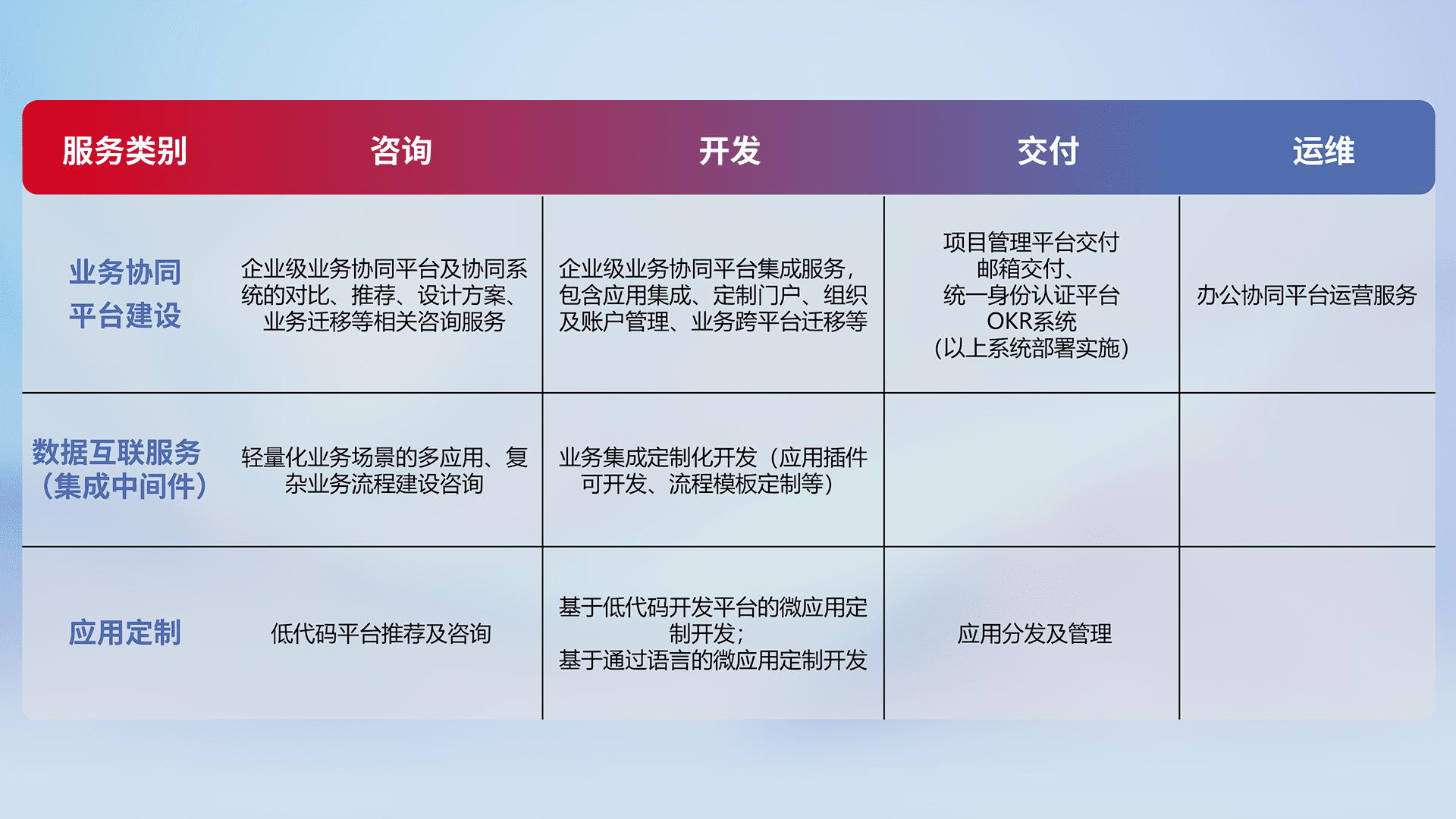 针对钉钉、企微、IDaas等平台级产品提供产品的规划、方案、交付、定制化开发等服务,实现如统一协同办公、智能客户服务、混合会议管理、智能数据查询、等业务场景,实现数字化转型。